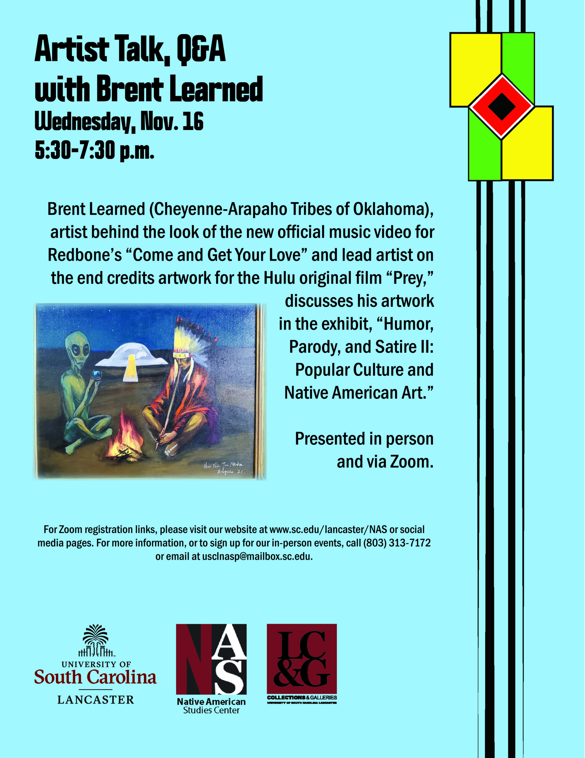 Brent Learned (Cheyenne-Arapaho Tribes of Oklahoma), artist behind the look of the new official music video for Redbone’s “Come and Get Your Love” and lead artist on the end credits artwork for the Hulu original film “Prey,” discusses his artwork in the exhibit, “Humor, Parody, and Satire II: Popular Culture and Native American Art” at 5:30 p.m. Wednesday, November 16 at the Native American Studies Center.